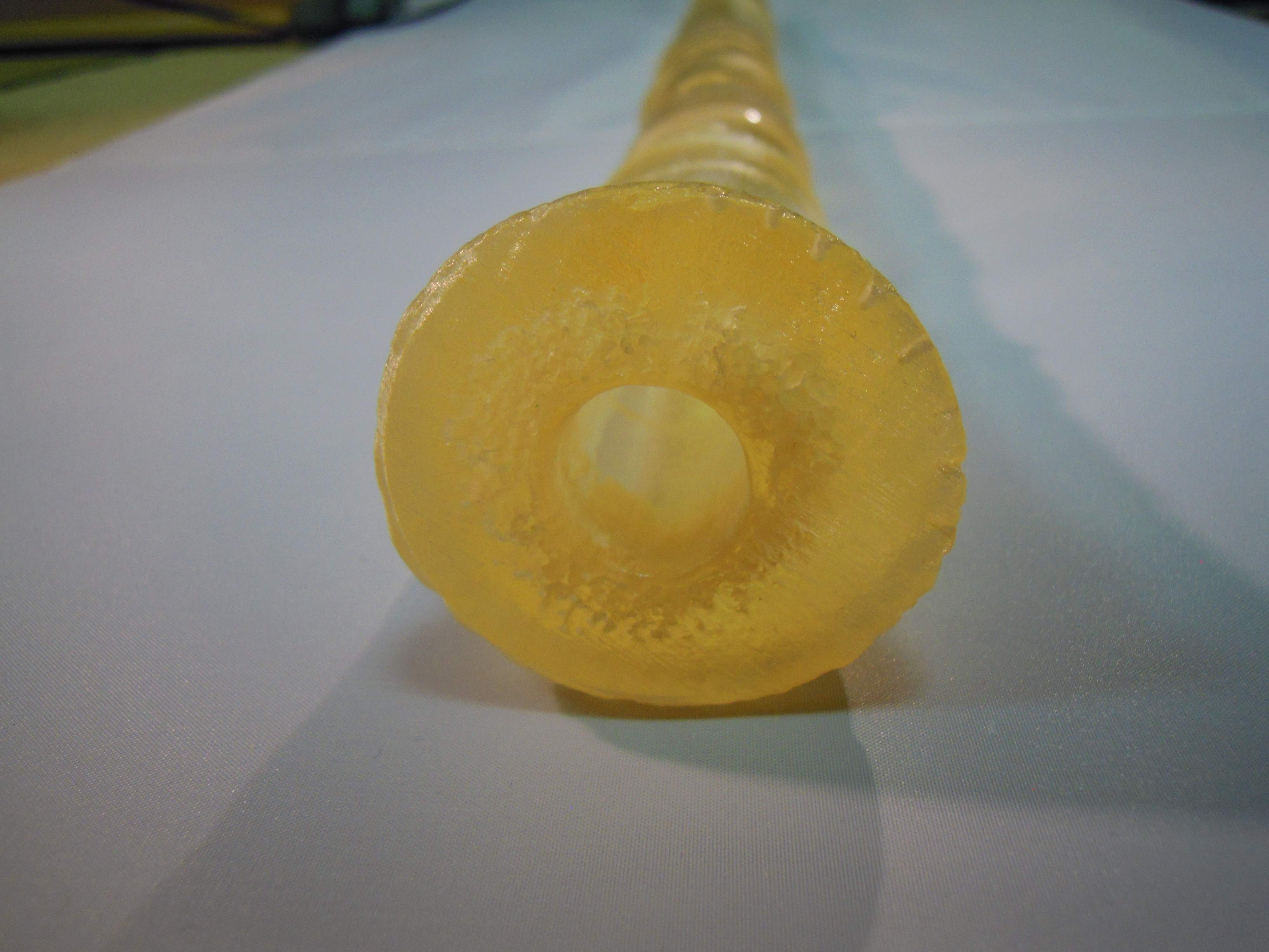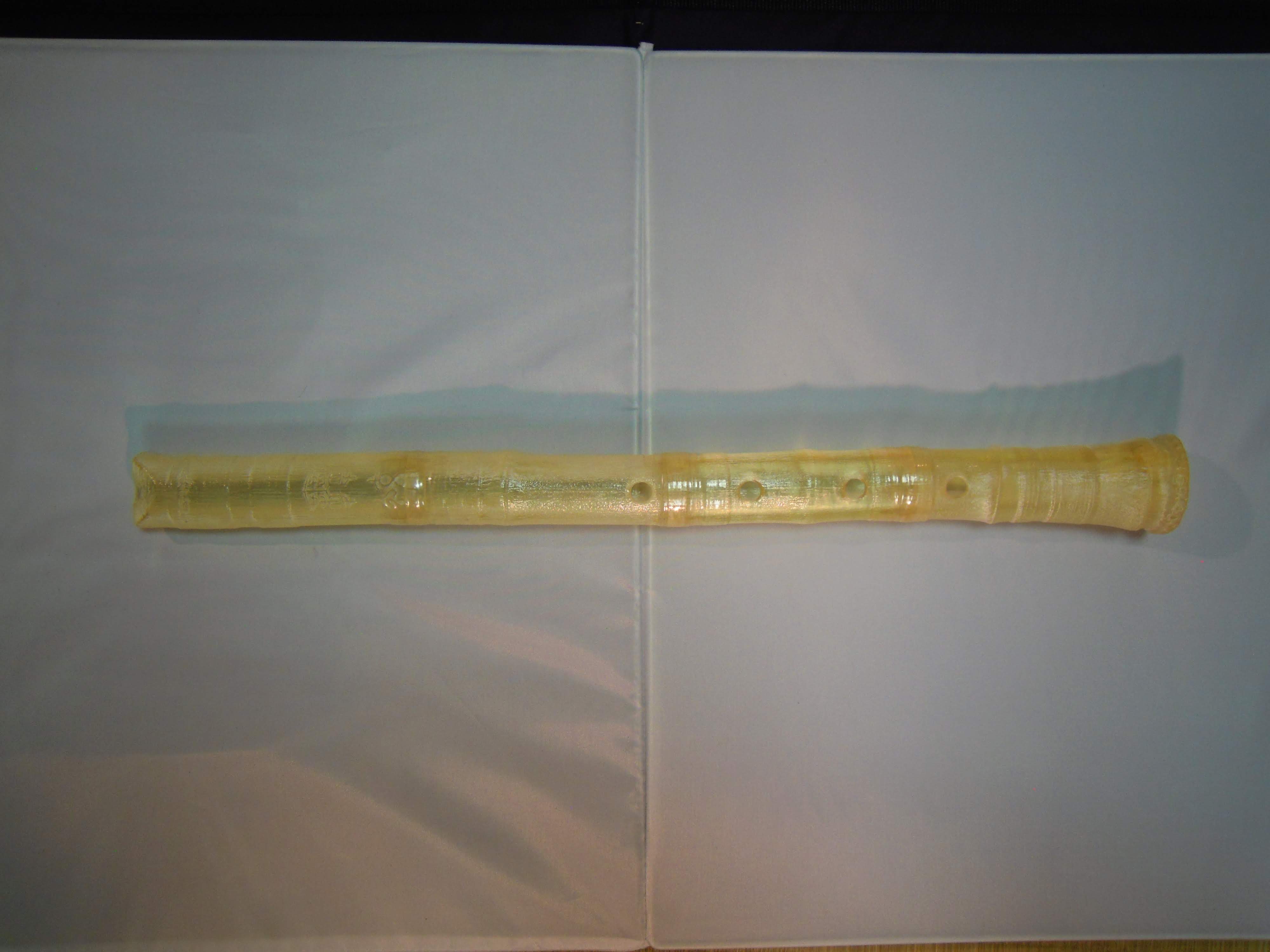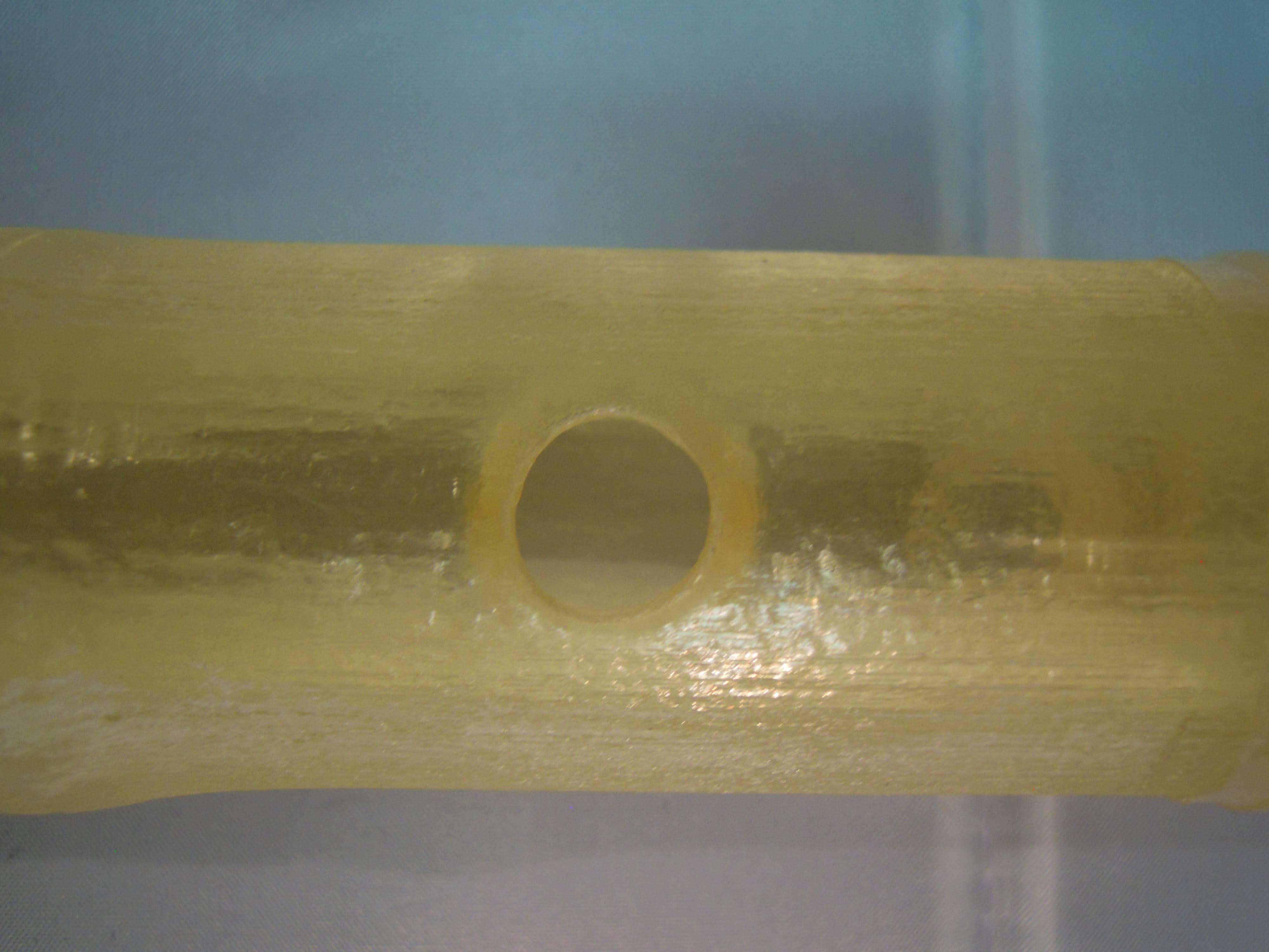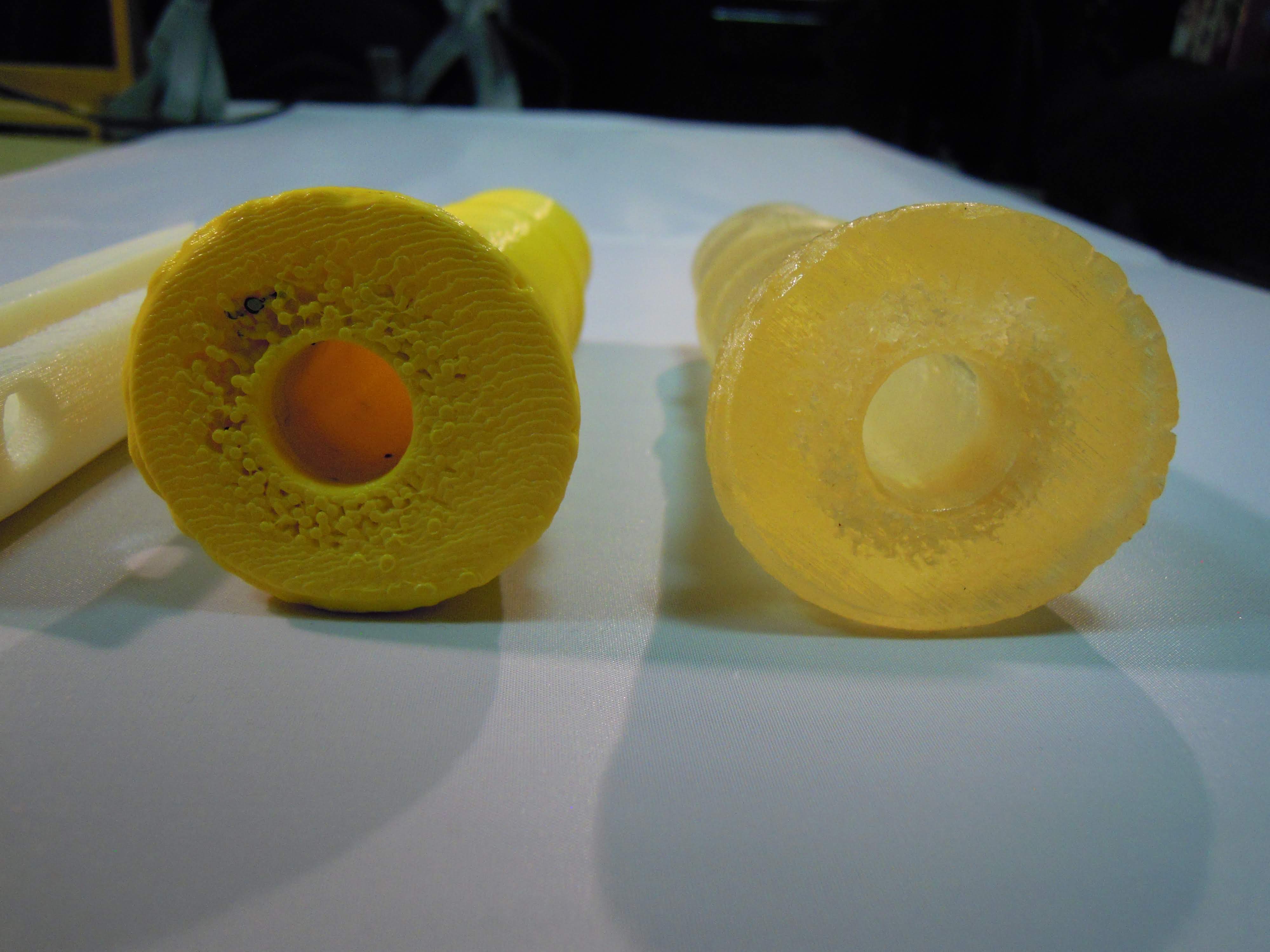 左から (1)「PJP方式 密度30%」(2)「PJP方式 密度50%」(3)「PJP方式 密度100%」(4)「インクジェット方式」(5)「PJP方式(管壁厚み1mmの中空構造)」(6)「FDM方式」